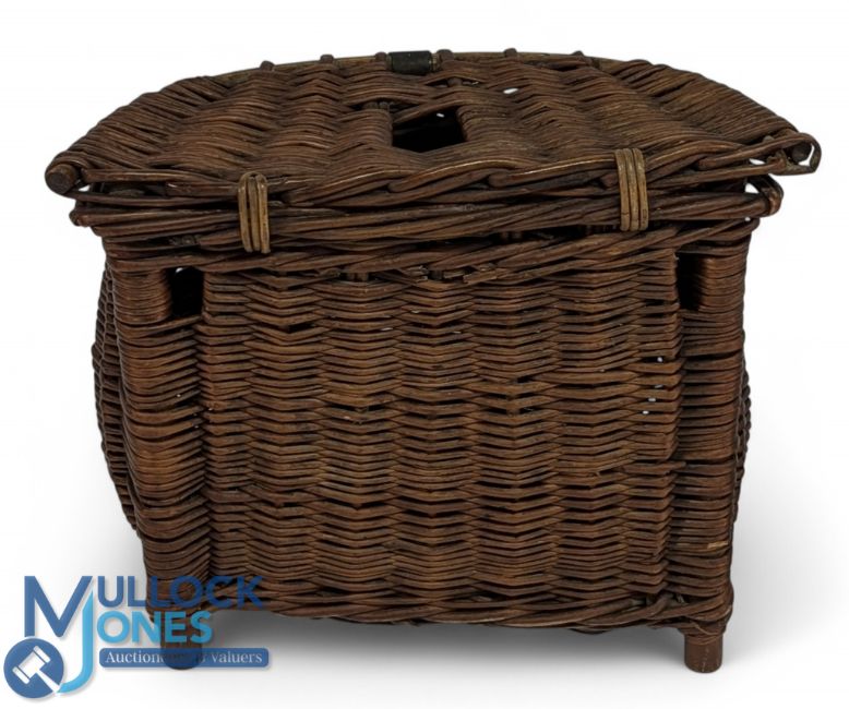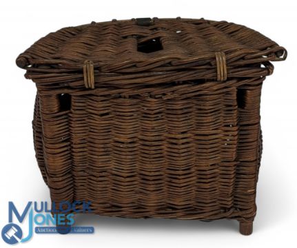Early willow pot bellied creel, standing 11" tall, 12" wide, the hinged lid with metal hasp, Victorian date stamp c1880, good example