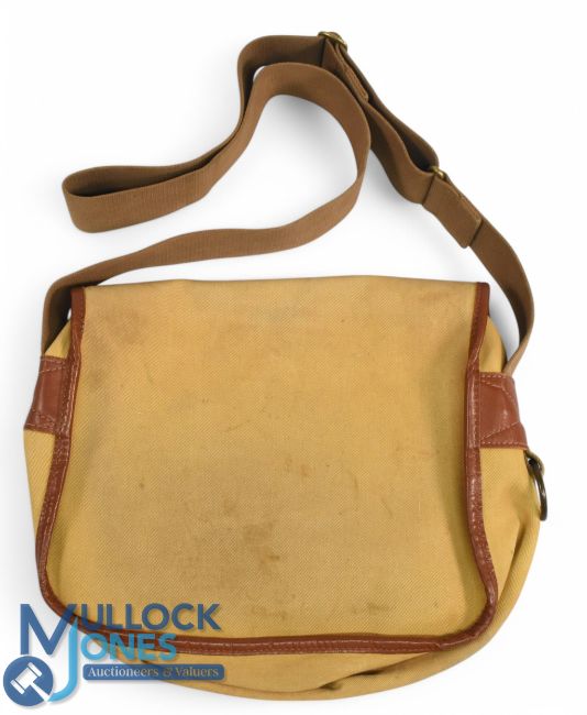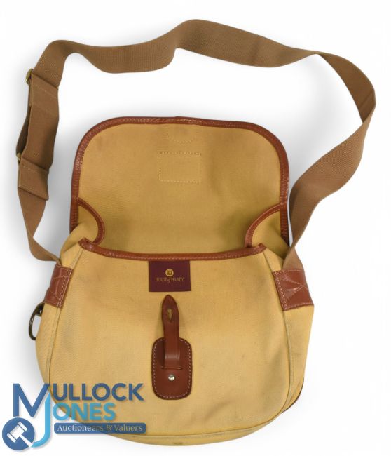 Hardy Alnwick "The Brook" canvas and leather shoulder bag, 11" x 10" x 3", one large pocket with divider strap and eye closure, 2" webbing strap, brass net ring. All stitching good, light use