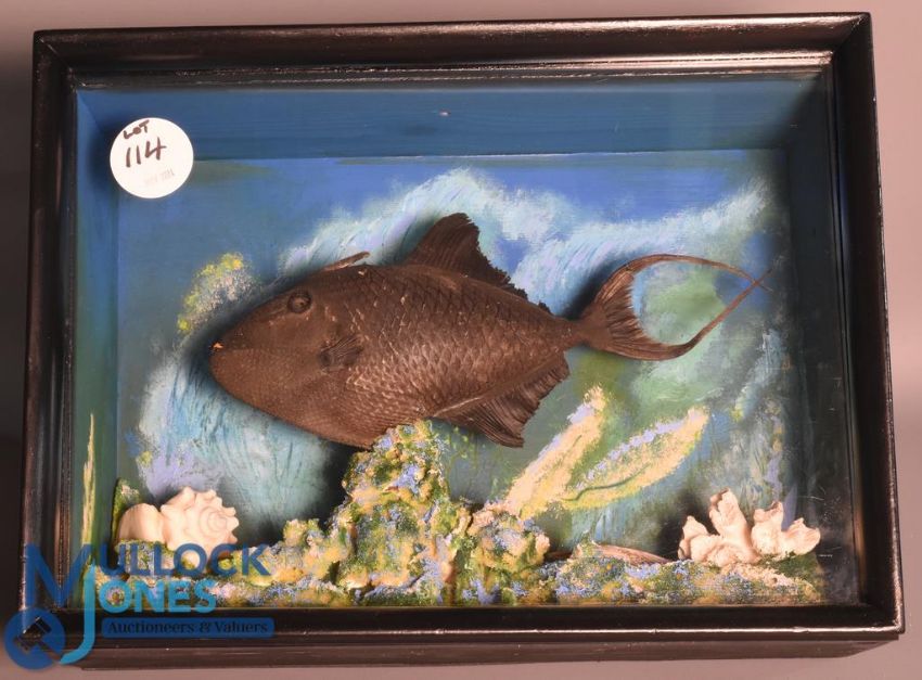 Cased Fish - Preserved Vampire Trigger Fish 'Odonus Niger' mounted in a flat front wooden case 15x11x7" approx. mounted over decorated coral, curious specimen