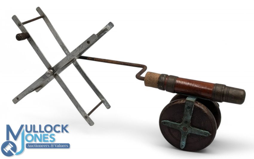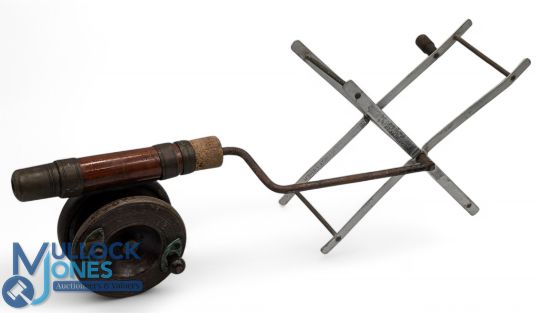 Period Farlows Co, London, Line Winder, with markings to brass handle, aluminium winder part marked kingfisher, and a wooden star backed reel attached