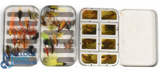 Richard Wheatley Alloy Fly Tin - 6" x 3 ½" with 12 fly grips and quantity of salmon flies. Okuma Fly Tin 15-SWR 6" x 4" x 1 ¼", 8 spring lids with quantity of salmon flies, Eartha foam to lid. (2)