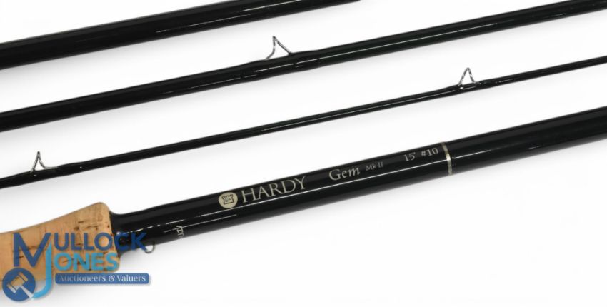 Hardy Alnwick GEM Mk II carbon salmon fly rod: 15ft 4pc line 10#, 262 handle with alloy down locking reel set, lined stripping rings, in Cordura tube. Very light use