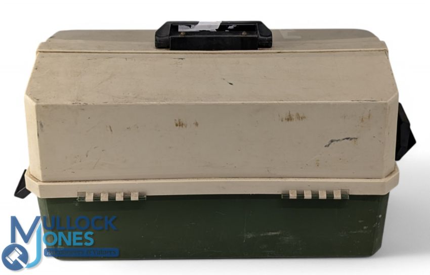 Cantilever Fishing Tackle box full of fishing lure, spinners, Tobby's, plugs, lead, line weights, and more