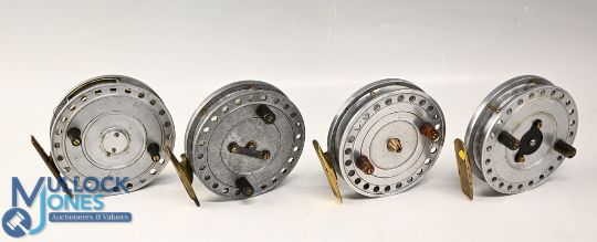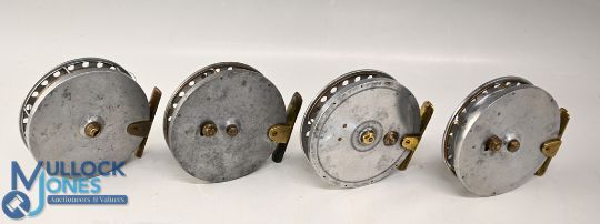 4x W.F. Homer Styled 'Flick-Em' trotting reels all 4 1/8" dia - with slight variations, all with twin handles, perforated faces, brass wire line guides, smooth brass feet, 3x with on/off check mechanisms, variations on latches, see images - o/w all appear in good working order