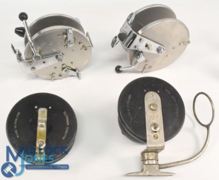 Allcocks Redditch large sea reel, 6" wide spool, serpentine counter balanced handle, star spindle tensioner, on/off check, anti reverse, on/off lever brake, all line guide. Allcocks Redditch large sea reel 6" wide spool, counter balanced handle, spindle tensioner, on/off check lever brake, alloy line guide, runs well. Allcock Aerialite surf side caster reel, 4" Bakelite spool, twin handles, spindle tensioner, on/off check, runs well. Allcocks Aerialite Bakelite reel, 5" spool, twin handles, spindle tensioner, on/off check, runs well. (4)