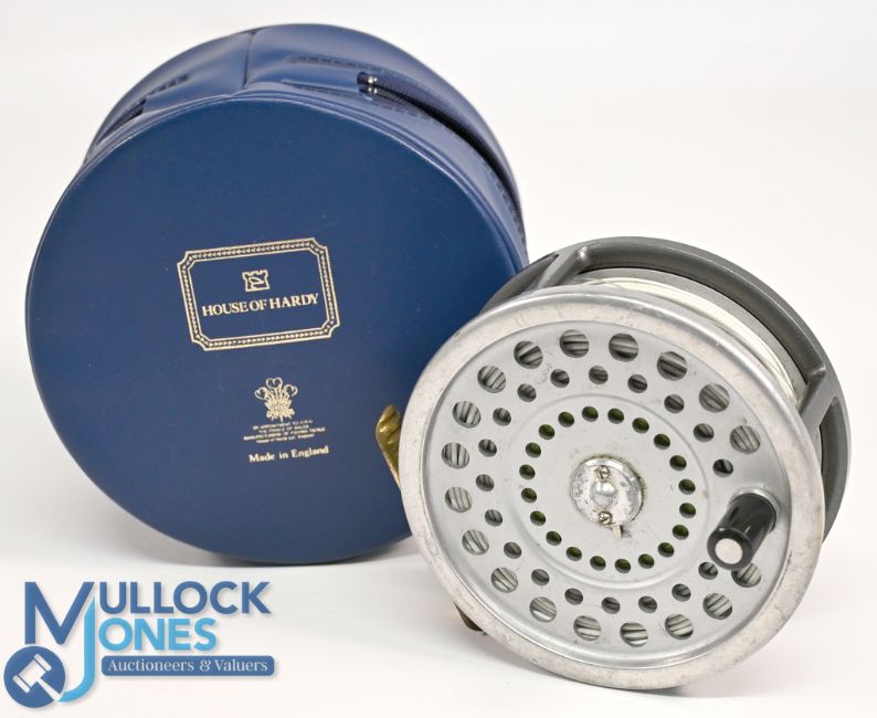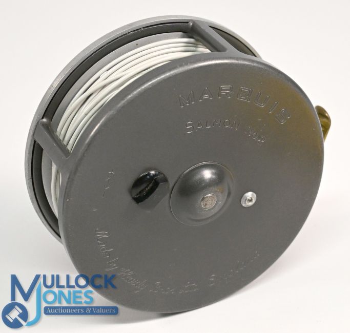 Hardy Bros "The Marquis" Salmon No 2 fly reel, 4 1/8" ventilated spool, 2 screw latch, black handle, rear tensioner, ribbed brass foot, constant check. Light use, in MZC, runs well