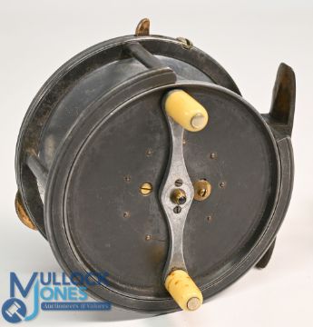 Early Hardy Bros by Dingley Silex 4 ½" wide spool alloy casting reel stamped D (William Dingley 1891-1911), internally with twin handles on handlebar cross bar, smooth brass foot, caged drum core, on/off check, with quarter rim cut out, rim adjuster and lever, quick release spool, good overall example