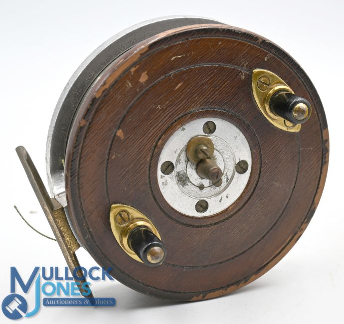 Zephyr style 'News of The World Prize Reel' wood and alloy centrepin reel with four screw latch, quick release spool, on/off check, smooth brass foot, twin black handle, surface wear, o/w a G example