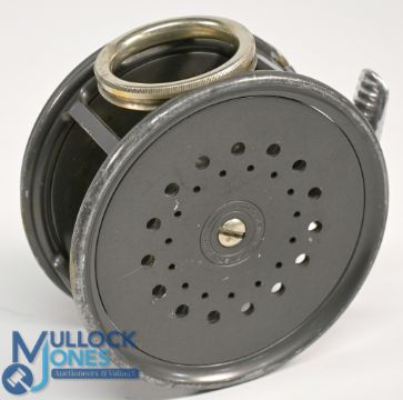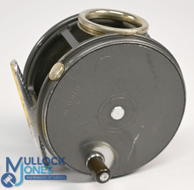 Hardy Bros "The Perfect" alloy salmon fly reel, 4 ¼" perforated wide spool, milled rim tensioner, constant check, rotating brass line guide (no marks), ribbed alloy foot, light rim wear. Runs very well. Straight line logo