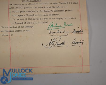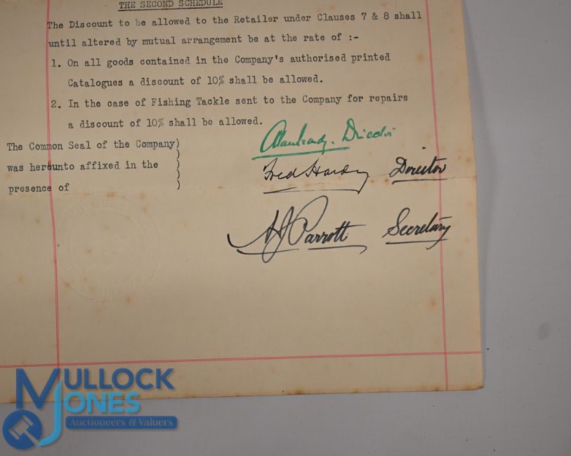 Hardy Brothers Alnwick Limited headed letter dated 24/4/1933 together with the mentioned agreement between Hardy Brothers and Walter Metcalfe which is signed by Fred Hardy (Director) and two others dated 31/3/1933 which has the embossed Hardy Brothers Alnwick Rod in Hand Trademark