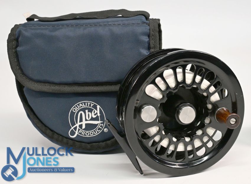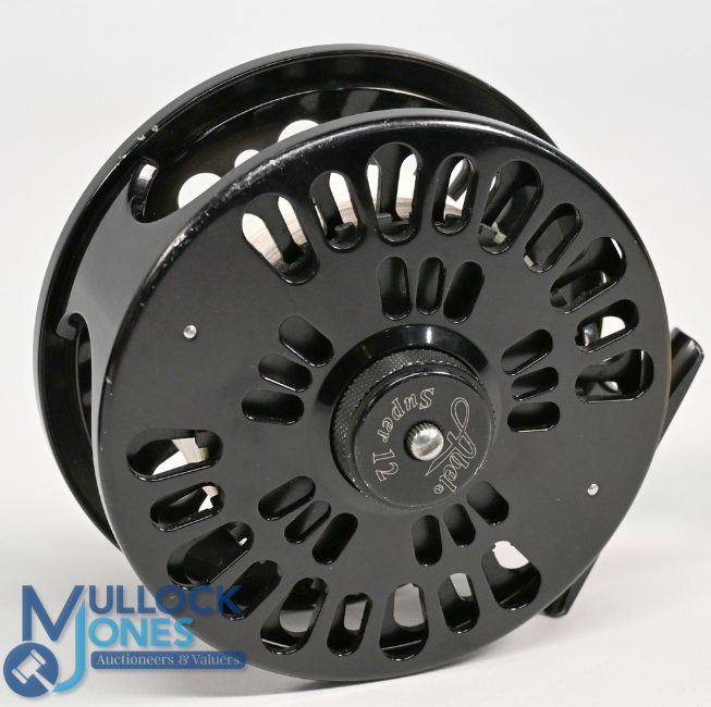 Abel USA Super 12 No 5818 alloy salmon fly reel 4 ½" ventilated wide spool, counter balanced handle, large rear spindle tensioner and combined spool release, light rim wear. In Abel original padded case with instructions. Runs well