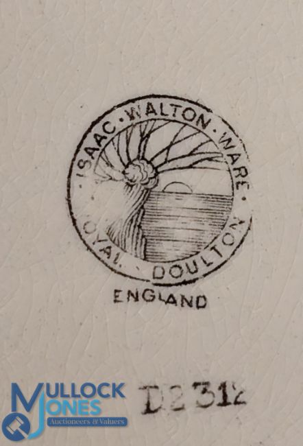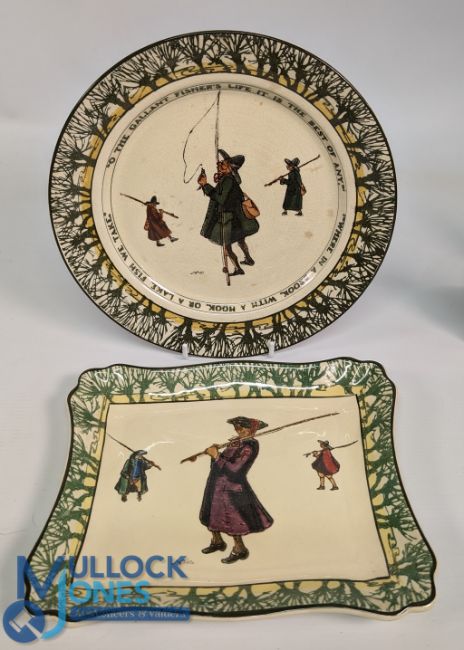 Royal Doulton Isaac Walton Ware, two plates 24cm and an oblong plate 22cm x 18cm painted angler scenes by Noke, with printed back stamps, with slight crazing