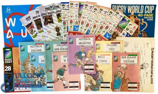 1987-2023 RWC Rugby Programmes (26): 1987 varied five of those p/copied team sheet inserts; 1991 Final (writing on cover), Sc v NZ play-off, E v NZ & Ire, W v Arg & Samoa, Aus v Arg & Samoa; 1999 W v Arg, Samoa, Japan & Aus (qu-final), NZ v Tonga & SA (play-off), Arg v Samoa & Japan, Samoa v Japan and Aus v SA (semi-final); 2007 Sc v NZ; 2015 Sunday Times Preview Brochure; 2023 Wales v Australia, big Wales win. Most VG