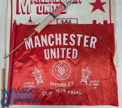 Three Period Manchester United Flags, a 1976 Wembley Cup Final silk flag, 1977 FA cup winners, and 1979 winners again flag, all with wood and bamboo pole handles. (3)