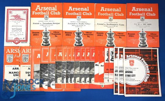 Selection of Arsenal home match programmes 1948/49 Spurs (FAC) (report of previous match v Manchester Utd inside), 1950/51 Spurs (champions), Stoke City (sof), Northampton Town (FAC), at Arsenal FA XI v The Army 8 November 1950, 1951/52 Manchester Utd (champions), Spurs (poor), 1952/53 Cardiff City, 1954/55 Sheffield Utd, Grasshoppers Zurich (friendly) 4 page, 1955/56 Portsmouth (mark), 1955/56 Burnley v Chelsea (FAC 3rd replay), Birmingham City (age wear), 1956/57 Spurs, 1958/59 WHU, 1959/60 Birmingham City, Manchester City, 1960/61 Everton, 1966/67 WHU, Nottingham Forest, 1967/68 Manchester Utd, Shrewsbury Town (FAC) (mark), 1968/69 Blackpool (FLC), 1969/70 Southampton (FLC replay), Stoke City, WHU, 1971/72 Ipswich Town, 1979/80 Derby County; fair. (28)