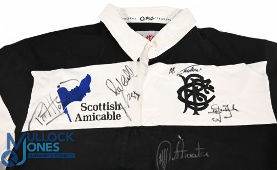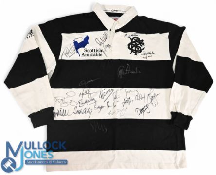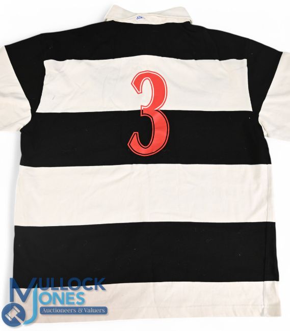 2001 Signed Barbarians Squad Dai Young Souvenir Rugby Jersey: Apparently a souvenir Cotton Traders XL version signed by the squad for each other following the 2001 game v the Australians, marked for prop that day David Young and donated by him to John Bevan nearly 30 years on from the wing's famous try-scoring match v NZ, 1973. Red stylised no.3 to rear of the otherwise usual fully-logoed official Baabaas issue.