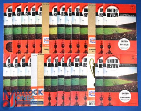 1967/68 Manchester Utd home match programmes complete season nos. 1 - 29 including Manchester City (10 February 1968 - postponed) plus complete season away programmes (21), FA Cup Spurs away; also European Cup away programmes v Hibernians (Malta), Hibernians (Malta) soccer magazine, Gornik Zabrze (teams left blank), Real Madrid (pirate); fair/good. (55)