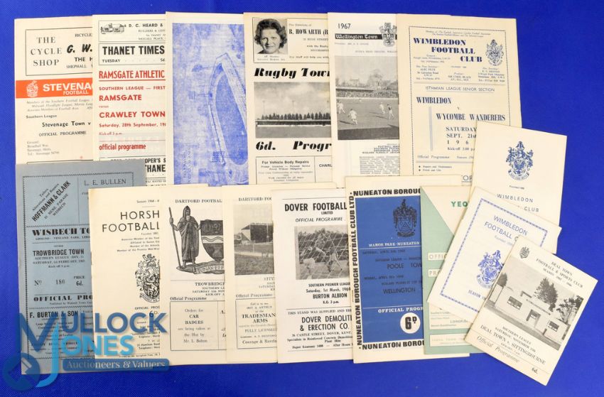 1960-70s Non-League Football Programme Collection: to include Ashford Town v Hastings United 61, Banbury United v Brentwood 67/68, Barnet FC v Worcester City 67, Barnet v Kings Lynn 69, Bath v Gravesen & North Fleetwood 69, Bedford Town v Rugby Town 67, Bedford v Chelmsford City 68, Bexley United v Weymouth 64/65, Brentford Town v Gloucester City, Burton v Poole Town 66/67, Canterbury v Bath City 67/68, Crawley Town v Barnet 69/70, Dartford FC v Towbridge 67, v Sittingbourne 65 and 66, Dover FC v Burton Albion 69, Dunstable Town v Banbury 66, Fateham Town v Alton Town 66, Hillingdon Boro v Bath City 70, v Poole Town 67, Horsham FC v Ruislip Maor 65, Kettering Town v Barnet 68, Kings Lynn v Rugby Town 68, v Guildford City 65, Nuneaton Boro v Poole Town 68, Poole Town v Corby Town 64, Sittingbourne v Kettering Town 64, Stevenage Town v Barnet 66, Ramsgate v Crawley Town 68, Romford v Yeovil Town 69, Rugby Town v Dartford 68, Wellington Town v Poole Town 68, Wimbledon FC v Poole Town 67 v Barnet 68, Wishbech Town v Trowbridge 69, Wimbledon v Wycombe Wanderers 63, Yeovil v Chelmsford - a good collection in clean condition VG