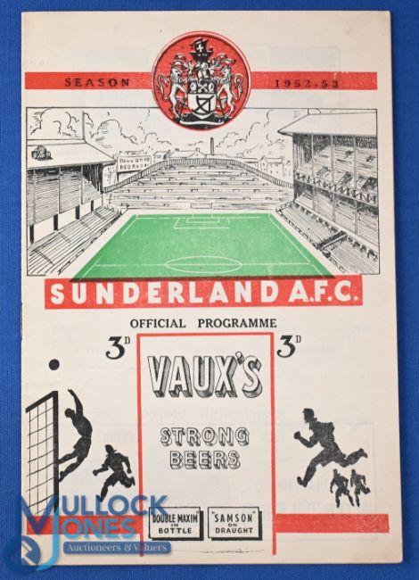 1952/53 Sunderland v Manchester Utd Div. 1 match programme Wednesday 18 February 1953 at Roker Park; fair/good. (1) NB: Johnny Carey (captain) in goal due to United goalkeepers injuries