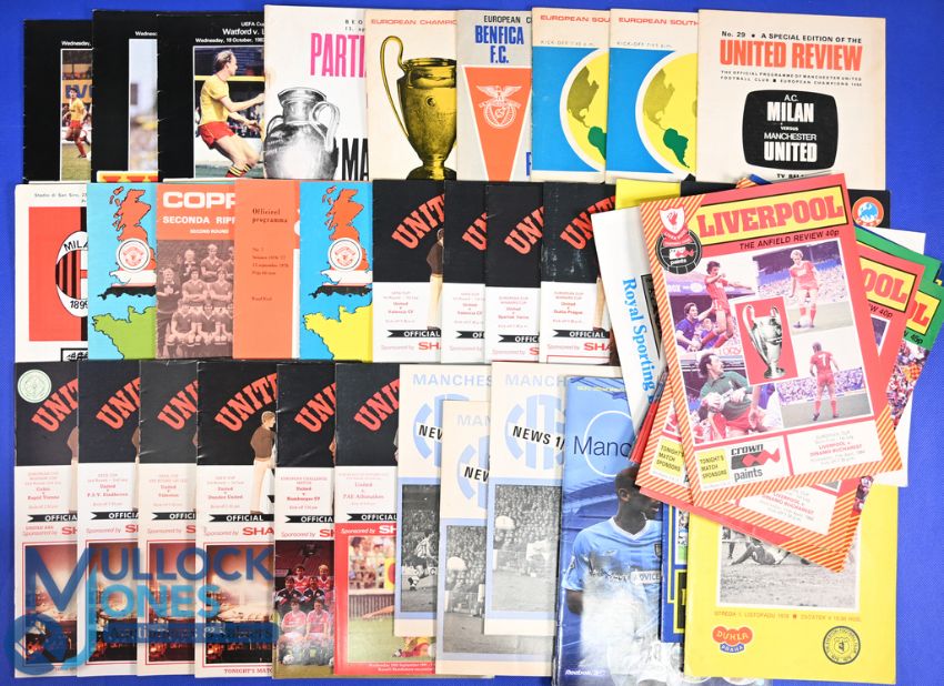 Selection of clubs in tournaments/friendlies to include Manchester Utd. 1965/66 away at Partizan (EC s/f), 1967/68 Real Madrid (EC s/f), 1967/68 Benfica (EC final), 1968/69 Estudiantes (American/Europe championship), AC Milan (beam back TV programme), AC Milan (pirate), 1976/77 Juventus, 1976/77 away at Ajax, 1977/78 St. Etienne (cctv from Plymouth to OT), 1982/83 Valencia (UEFA), 1983/84 Spartak Varna (ECWC), Dukla Prague (ECWC), away at Dukla Prague, 1984/85 PSV Eindhoven (UEFA) neutral at OT Celtic v Rapid Vienna (ECWC), Videoton (UEFA), Dundee Utd (UEFA), 1988/89 Hamburg SV (challenge match), 1991/92 Panathinaikos (ECWC); Manchester City 1969/70 Atletico Bilbao (ECWC), SK Lierse (ECWC) x 2, 2003/04 Sporting Lokeren (UEFA); Everton v 1978/79 Dukla Prague, away at Dukla Prague; Liverpool v 1983/84 Dinamo Bucharest EC s/f x2, 1984/85 Lech Poznan (EC), Benfica (EC), Austria Memphis (EC), Panathinaikos (EC s/f), 1986/87 Denmark Select XI (friendly); Watford v 1980/81 Red Star Belgrade (friendly), 1981/82 Sporting Lokeren (friendly), 1983/84 Spartak Sofia (UEFA), Kaiserslautern (UEFA), Sparta Prague (UEFA); fair/good. (37)