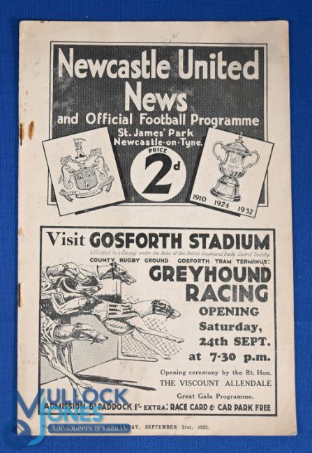 Pre-War 1932/1933 Newcastle Utd v Glasgow Rangers friendly match programme 21 September 1932 at St. James Park; slight rust to staple, overall fair/good. (1) NB: FA Cup Winners v Scottish Cup Winners.
