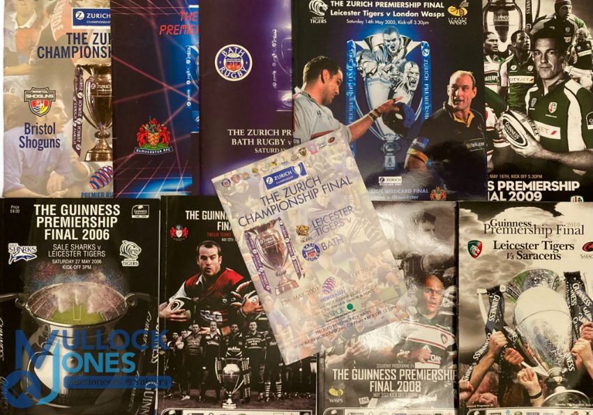 2001-2010 Premiership Play-off Final Rugby Programmes (10): Many sponsors - Zurich, Guinness, Aviva, Gallagher across the years, and many ever-glossier and bigger issues. VG/Exc