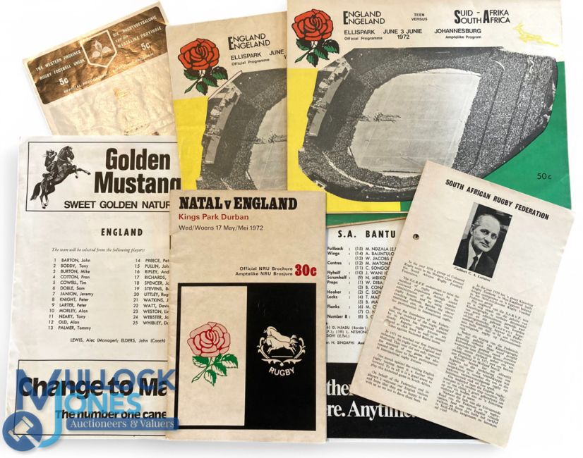 1972 England in S Africa Rugby Programmes (6): The surprise win v S Africa at Ellis Park under John Pullin (2, one worn), the 'extracted from binder, p/holes, minus cover(?)' example from the historic first clash with the coloured SARF 'Proteas' XV, the insert for the Bantu match and the issues from Natal & W Province. Otherwise G/VG