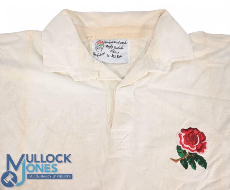 1991 Jason Leonard Matchworn England Grand Slam Rugby Jersey: One of England' finest ever, 114-times capped loosehead, later RFU President. From his debut season at 22 and winning the Grand Slam, still bearing some of the grime of the game, a big jersey for a big man in every way, RFU's own Twickenham make. Terrific.