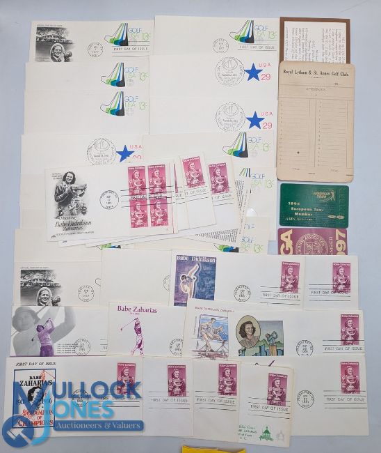 USA Golf Themed First Day Covers 1977 13c franked envelope, 1981 Babe Zaharais covers and envelopes, a 1930s Royal Lytham & St Annes Golf Club score card, 1998 Jimmy Hitchcock European tour member card, and 1997 PGA member card signed