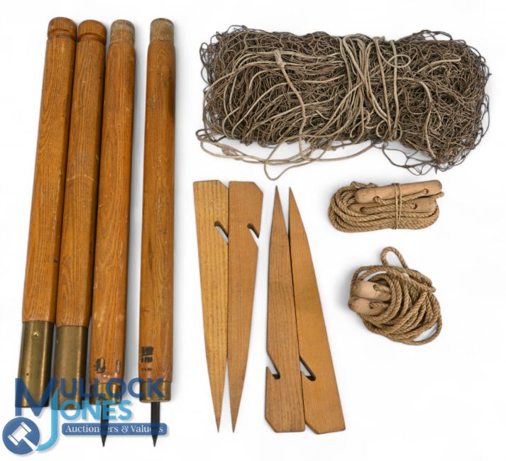 Period French Patented Lawn Tennis Court Kit, collapsible posts with brass middles, net, stakes, ropes and turnbuckles, c1900