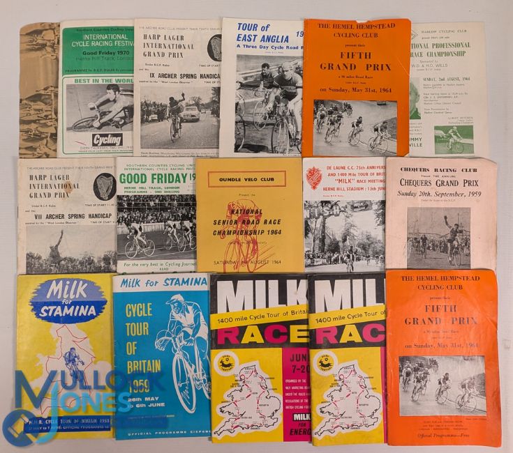 1958-1970 British Cycling Programmes Milk Race Road Races Cyle Tours, a good selection to include 1958 MMC cycle tour of Britain Milk race, 1959 and 1964 x2, plus a De Laune CC 75th anniversary Milk race meeting Herne Hill stadium 1964, Hemel Hempstead cycle club 5th grand prix 1964 x2, Chequers racing club grand prix 1959, Harlow road race championship 1964, Oundle Velo Club national senior road race championship 1964, Southern Counties cycling union international cycle racing festival 1964 and 70, Archer road club Harp Lager international grand prix 1964 and 65, Tour of East Anglia 1965 (4)