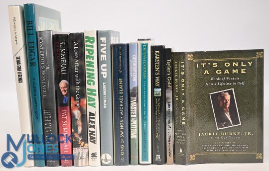 13x Golf Auto Biographies and Biographies to include Texas Golf Legends 1993 Curt Sampson ex-library, Bill Edgar A Legend in Amateur Golf 1995 David Worley (signed), The Mysterious Montague 2008 Leigh Montville, Summerall On and Off the Air 2006 Pat Summerall, A Love Affair with the Game 2002 Frank 'Sandy' Tatum, Ripening Hay Tales from a Golfing Life 1989 Alex Hay, Five Up 1991 Laddie Lucas, The King of Swings Johnny Goodman, the Last Amateur to beat the Pros at their Own Game 2006 Michael Blaine, George Law The Master of Putting 1986 Al Barkow, Johnny Goodman 1997 Walter J Curtis (signed), Karsten's Way 2000 Tracy Sumner, Taylor's Gold 2010, It's Only a Game Jackie Burke 2006 Guy Yocum, all in very good condition