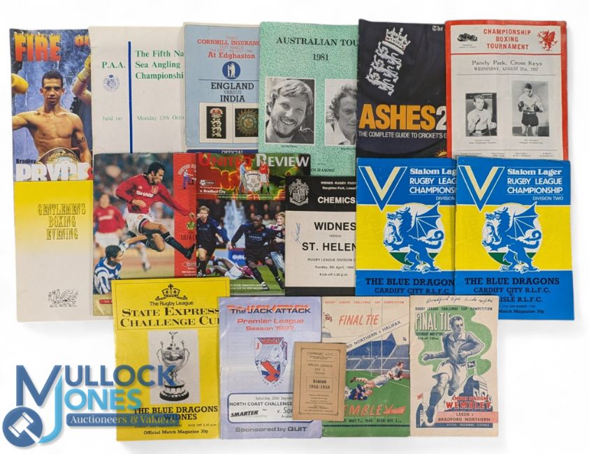 1947-2001 Mixed Sports programmes covering cricket, rugby league, boxing, football and angling, 1947 Challenge League Final Leeds v Bradford Northern, 1949 Challenge Cup Final Bradford Northern v Halifax, Cwmparc AFC Welsh division II season 1948-49 fixture list with results filled in, Widnes v St Helens 1980, the Blue Dragons v Widnes 1981, Cardiff City v Carlisle and Halifax 1981, North Coast Challenge Shield v Sorrento 1997, Manchester United v Bradford City 1999, Manchester United v Rotor Volgograd UEFA Cup 1995, The 5th National Sea Angling Championships 1975, Cornhill Test England v India 1986 at Edgbaston, Australia Tour 1981 Cricket Programme, Boxing Evening multi signed Nicky Piper, Colin Jones, Darren Morgan (Snooker), Graig Evand (Golf) Championship Boxing Tournament Pady Park 1957, Pryce v Rees 2001, a good mixed sports lot