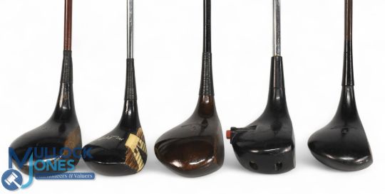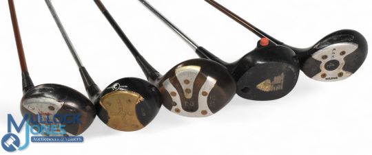 5x Various woods to incl Johnny Revolta 2 wood, a dark stained stamped FRF, Sweepstakes Wilson 4 wood Nicoll of Leven Par Ex-Cellence and a Swingrite Patent plastic head with adjustable power setting - all gripped