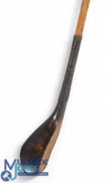 Wm Dunn c1875 dark stained beechwood short spoon head measures 5 5/8" x 1 7/8" x 1 1/8" - 38" shaft length - fitted with original hide grip with thick under listing- Part of The MacKenzie Ross Collection. Alexander MacKenzie Ross was perhaps the most exceptional golfer to emerge from the Society during its Bruntsfield, Musselburgh, and early Barnton days. A member for thirty-eight years until his death in April 1915, his achievements remain unmatched. He claimed the Society's Gold Medal thirteen times - most recently in 1908 at the age of 58 - and won the Autumn Gold Medal an extraordinary eighteen times. At 57, he delivered one of his finest performances by setting a new Barnton course record with a score of 75. He was Chairman of the Forth Rubber Company. His legacy continued through his son, Philip MacKenzie Ross, a prominent figure in Scottish golf. The owner of Edinburgh's Café Royal Hotel and a member of the Edinburgh Burgess Golfing Society, Philip was a frequent medallist at prestigious courses such as Gullane, Luffness, and North Berwick. He later became a founding member of the International Society of Golf Architects and established his own practice in the 1930s. As a golf course architect, Philip was held in equal regard to legendary contemporaries such as Herbert Fowler, Harry Colt, and Tom Simpson.