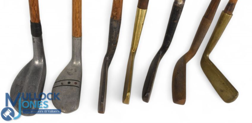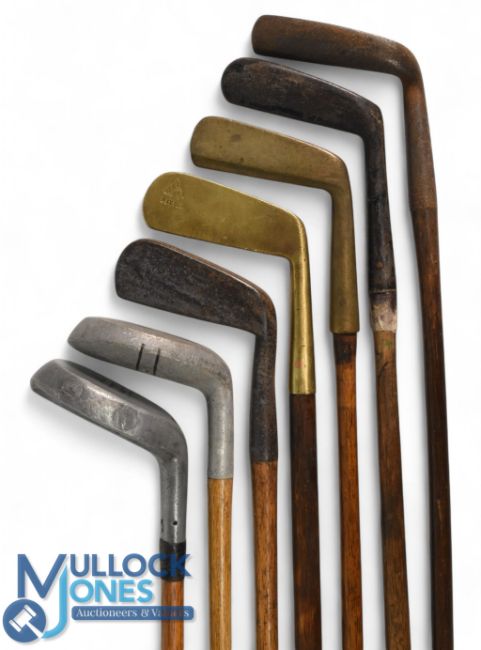 7x Various putters - incl 2x brass head; straight blade and wry neck, an early Gem model metal head, Cochrane bent neck, later Gem model t/w 2x alloy mallet heads; JBH upright putter by Imperial Golf Co and a Mills Ray model with repaired hosel - 1x without grip