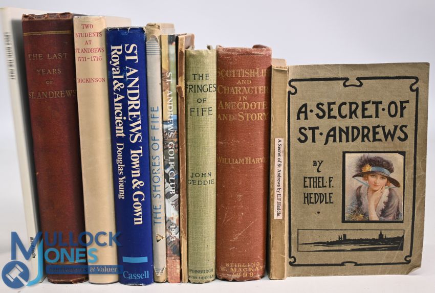 Scottish Golf publications or books with references to Golf to include Links with the Past St Andrews 2000 Bob MacAlindin (signed), The Last Years at St Andrews September 1890 to September 1895, Two Students at St Andrews 1711-1716 William Croft Dickinson 1952, St Andrews Town & Gown Royal & Ancient 1969 Douglas Young, The Shores of Fife 1922 John Geddie, The 150 years A History of the Sr Andrews Golf Club 1843-1993 Eric D Clark, Twenty Views of Old Edinburgh, The Fringes of Fife 1894 John Geddie, Scottish Life and Character in Anecdote and Story 1899 William Harvey, A Secret of St Andrews 1923 Ethel F Heddle, mixed condition with some rusty staples, additional writing, marks, creases