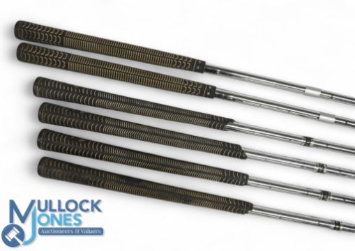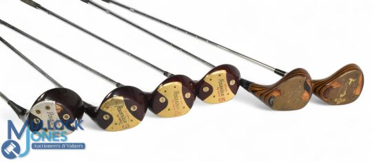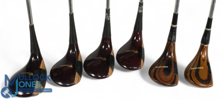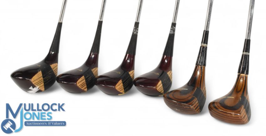 6x Assorted Woods - featuring 2x George Nicoll of Scotland SL-9 'Henry Cotton' 4 (crack to head and hosel) and 5 woods, t/w 4x Powerbar by Vance H.T.3411 woods featuring 1, 3, 4 and 5 woods in dark finish - all appear with grips and useable - with signs of use