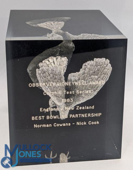 1983 England v New Zealand Best Bowling Partnership Observer/ Honeywell Cornhill Test Award to Norman Cowans and Nick Cook - a resin cube with eagle encases #17cm tall