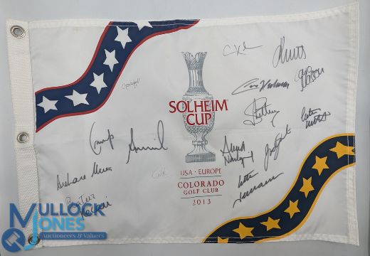 Golf Autograph Official 2013 Solheim Cup Flag autographed by members of Team Europe. The 2013 Solheim Cup was the 13th edition of the Solheim Cup matches, held on August 16-18 at the Colorado Golf Club in Parker, Colorado. Europe won the matches by a score of 18-10