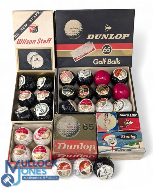 Selection of 27x Wrapped Dunlop 65 Golf Balls - features 2x makers card boxes, Dunlop Warwick golf balls (x2), Dunlop 65 boxes (x2) and a loose Dunlop 65 ball t/w an individual Sixty five boxed ball, and a BC 2000 golf ball USA, plus a Wilson Staff box - nice selection