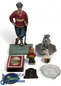 Golf Collectable: to include ceramic figure The Colonel Lynmouth Arcadia golf ball crested ware, glass golf ash tray (slight chips to edge), a metal caddie figure as tray, cast door stop, golf blazer badge, bronze golf plaque and packet of Johnnie Walker playing cards golfing 1820