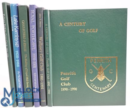 6x Golf History hardcover Books including Limited Edition and Centenary Books to include A Centenary Celebration Purley Downs Golf Club 1894-1994 Dick Glynne-Jones limited edition (592/1000) multi-signed, Lake Karrinyup Country Club 1928-1988 Michael White, Characters & Kings The Making of Royal Mid-Surrey 1991 Peter Ryde limited edition (155/1100), Royal Porthcawl Golf Club 1891-1991 Leo McMahon, Wallasey Golf Club 1891-1991 limited edition (1000), A Century of Golf Penrith Golf Club 1890-1990, all in very good-good condition with some small additional writing, small marks
