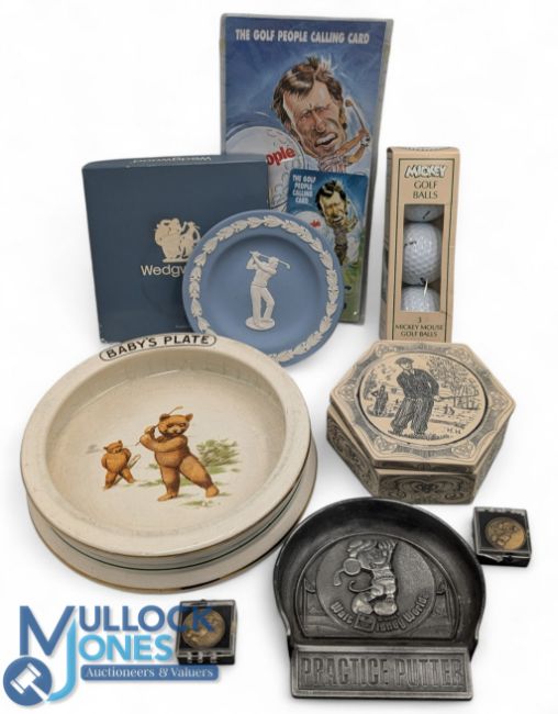 Golf Collectables: an eclectic mixture to include Walt Disney practice putter ball markers, golf balls, 1997 Open championship calling card, Wedgwood golf pin dish in original box, a resin golf themed box, a Winton Teddy bears golfers baby plate - slight crazing