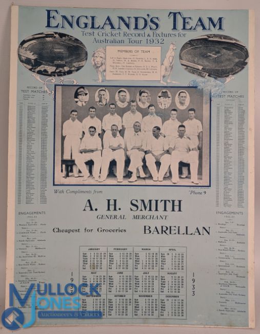 Bodyline 1932-33 Cricket Test Shop Calander Advertising - a reprinted record and fixtures for the 1932-33 tour - mounted on hardboard - size #43cm x 55cm displays well