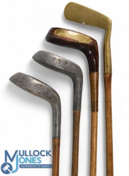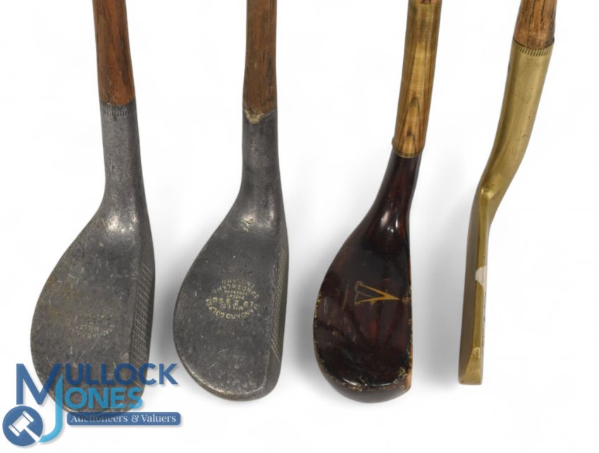2x Braid Mills putters; one with light hosel damage, a brass bent neck blade stamped accurate putter, t/w a modern The Laird wooden laminate mallet head putter by the St Andrews Golf Co - all with grips (4)