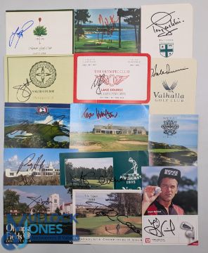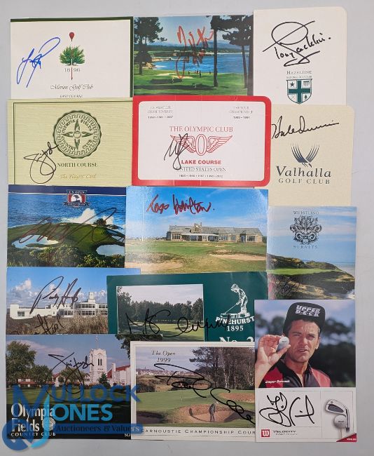 14x Signed Golf Postcards Scorecards with noted autographs of Jasper Parnevik, Paul Lawrie, Padraig Harrington, Todd Hamilton, Martin Katner, Graham McDowell, Webb Simpson, Hale Irwin, Jim Furyk, Tony Jacklin, Justin Rose - a good collection. Signatures personally obtained by a professional autograph hunter over many years