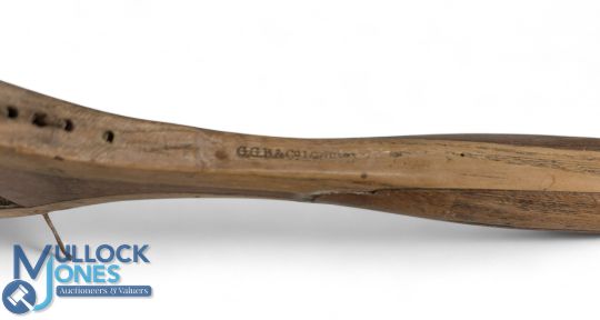 c1890 Ball Tail Tennis Racket, George Gibson Bussey scarce example of a ball tail lawn tennis racket by Bussey 'The Bughey'. with convex wedge. The wedge is embossed in gilt 'The Tournament ' with the Bussey logo 'GEO G BUSSEY & Co' at the top of the handle. The racket has a good straight frame with the original worn gut strings and its unusual ball tail handle