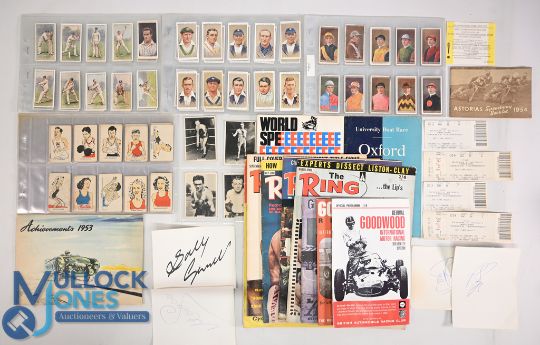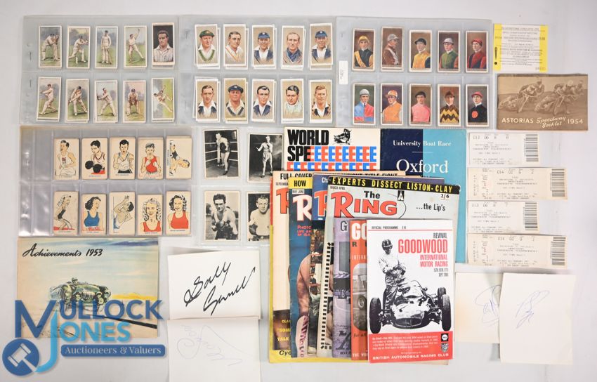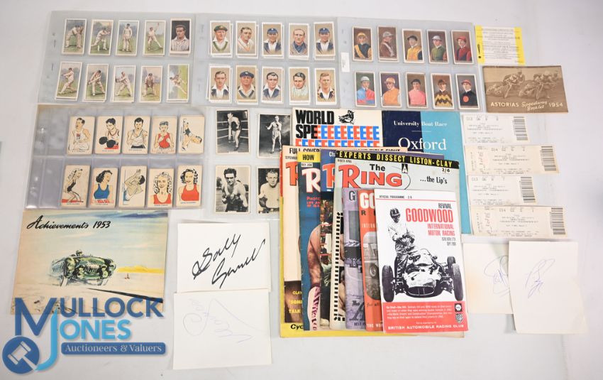 Mixed Sports Programmes Magazines Cigarette Cards, Signatures, to include 1955 Oxford v Cambridge boat race programme, speedway world final 1967 Goodwood revival 2000,2005,2006 TT guide 1964 from motor cycle magazine, boxing the ring magazines x 4b Asorias speedway booklet 1954, Wakefield achievements booklet 1953 Kippys popular Olympic cards Ogdens jockey and owners cards, Players cricketers 1934, Wills cricketers 2nd series, snooker tickets, signed sheets from Pete Sampras, Sally Gunnell, Monica Seles, Steffi Graff