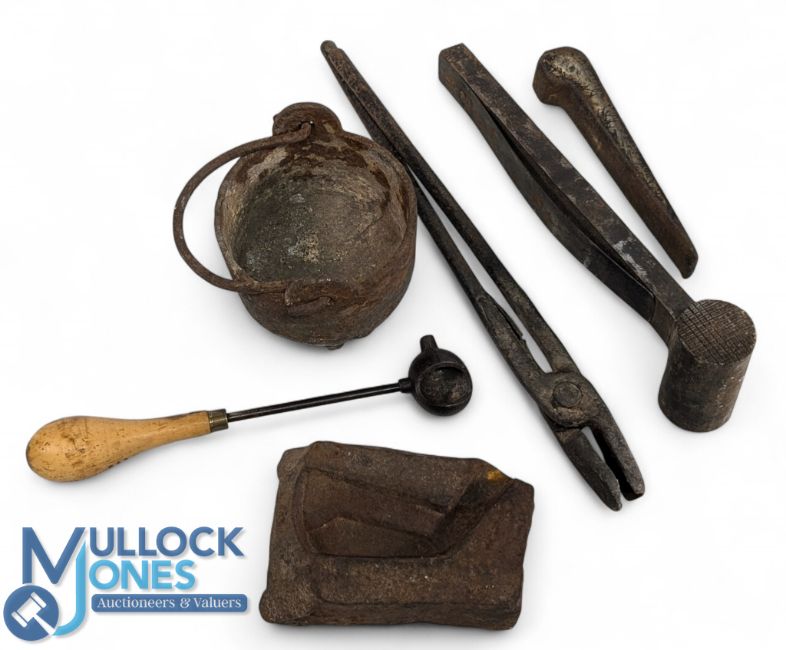 Period Golf Club Maker Tools, casting items, to include a club head mould, kettle, tongs and metal pouring tool and others - all have come from an old golf club makers workshop